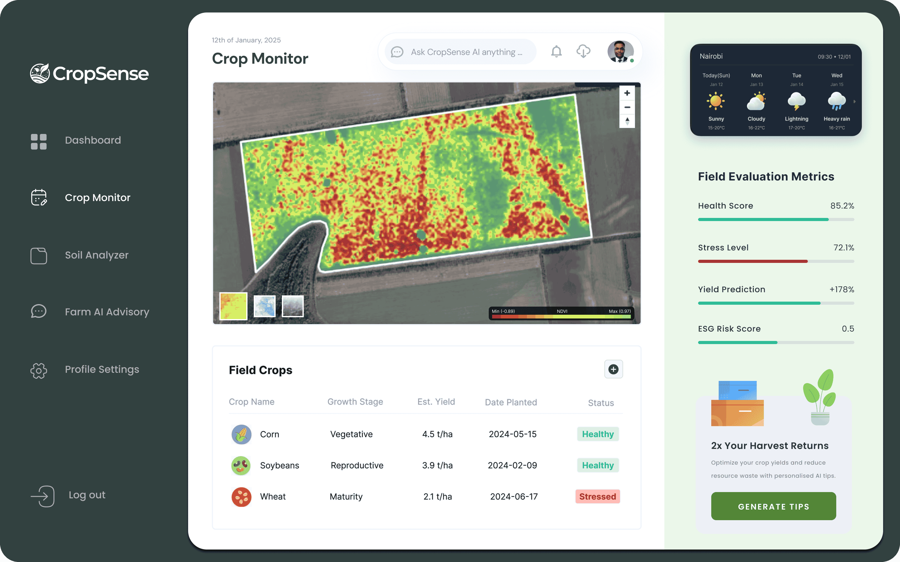 CropSense provides hyperlocal insights on crop health and growth stages, soil moisture and nutrient levels, weather forecasts and historical climate data, pest and disease risk predictions, and market prices and trends. This data is meticulously tailored to the specific conditions of each region, ensuring unparalleled accuracy and relevance for farmers and agribusinesses.